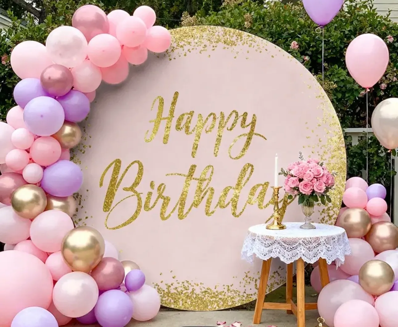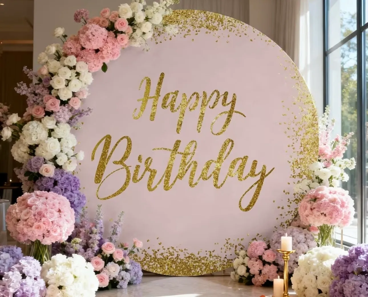 Backdrop Pink Happy Birthday on a White Circle backdrop Stan