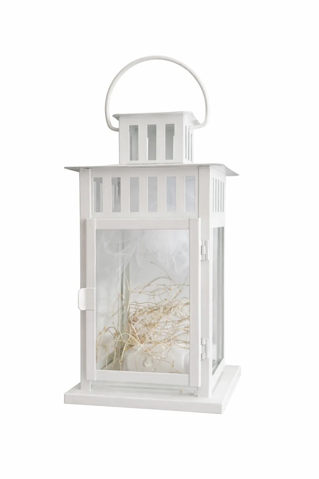 Our beautiful white square style decorative lantern adds a soft visual glow to each place setting. This lantern has wire led lights inside battery operated. Ideal for creating atmosphere without harsh lighting, and perfect for themed parties or evening setups.