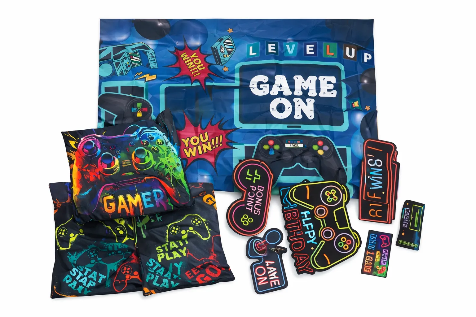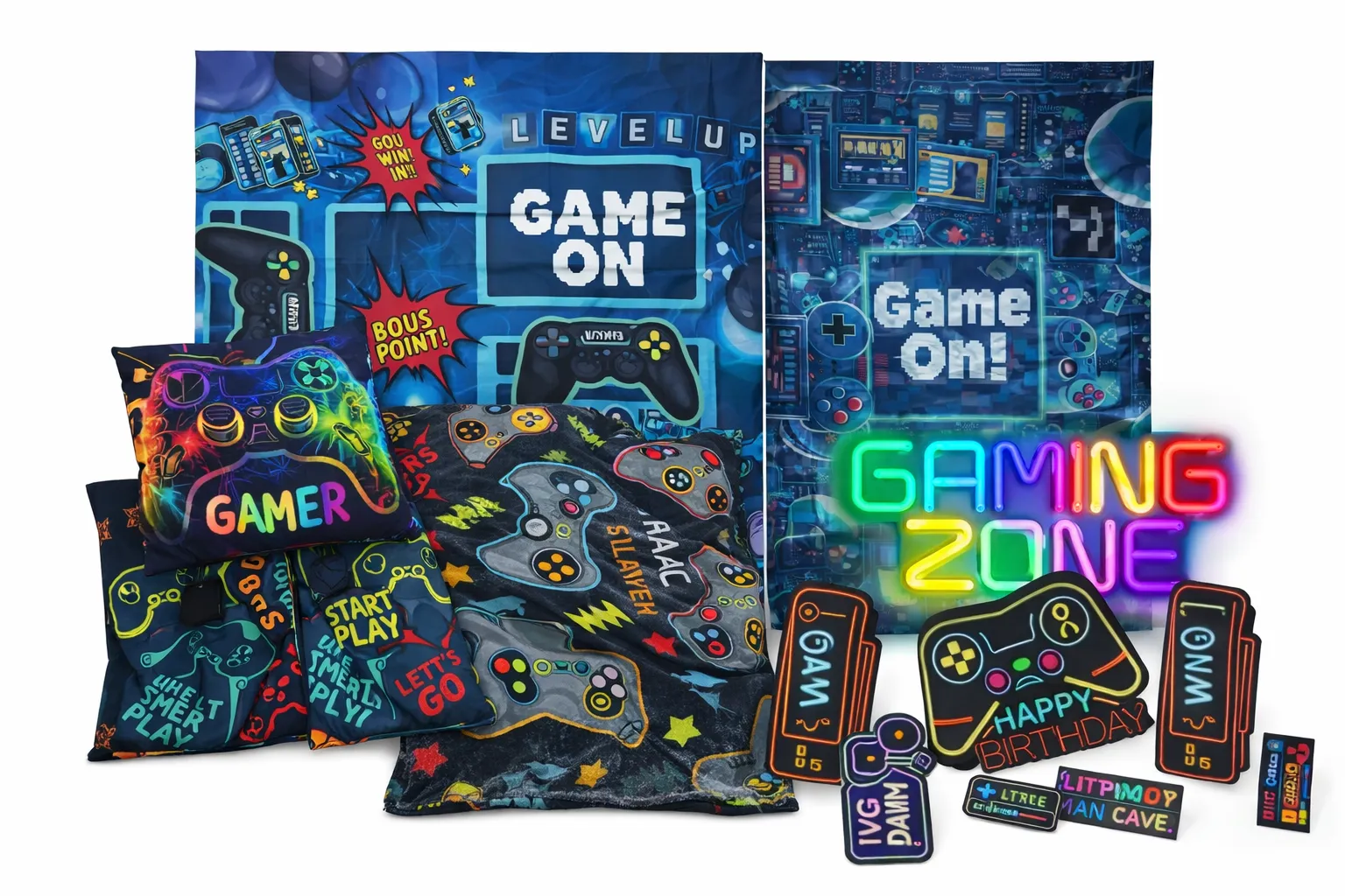 Imagine the lights dimmed, the Gaming Zone neon sign glowing, and a space that instantly feels like a gaming zone the moment guests walk in. This bundle brings together all the visual details that turn a standard room into a party-ready setup, without needing to source or style everything yourself.