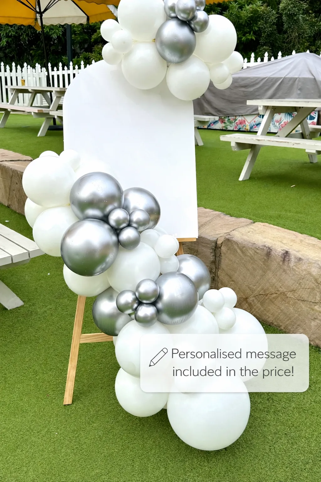Free-standing white backdrop displayed on an easel stand, ideal for entrance points, drinks areas or photo booths. Hire includes personalised wording of up to four words. Balloons are not included.