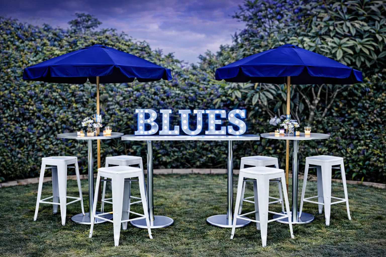 To finish the look, the setup features LED light-up letters spelling BLUES (22cm tall), creating a standout focal point and setting the tone for your event.