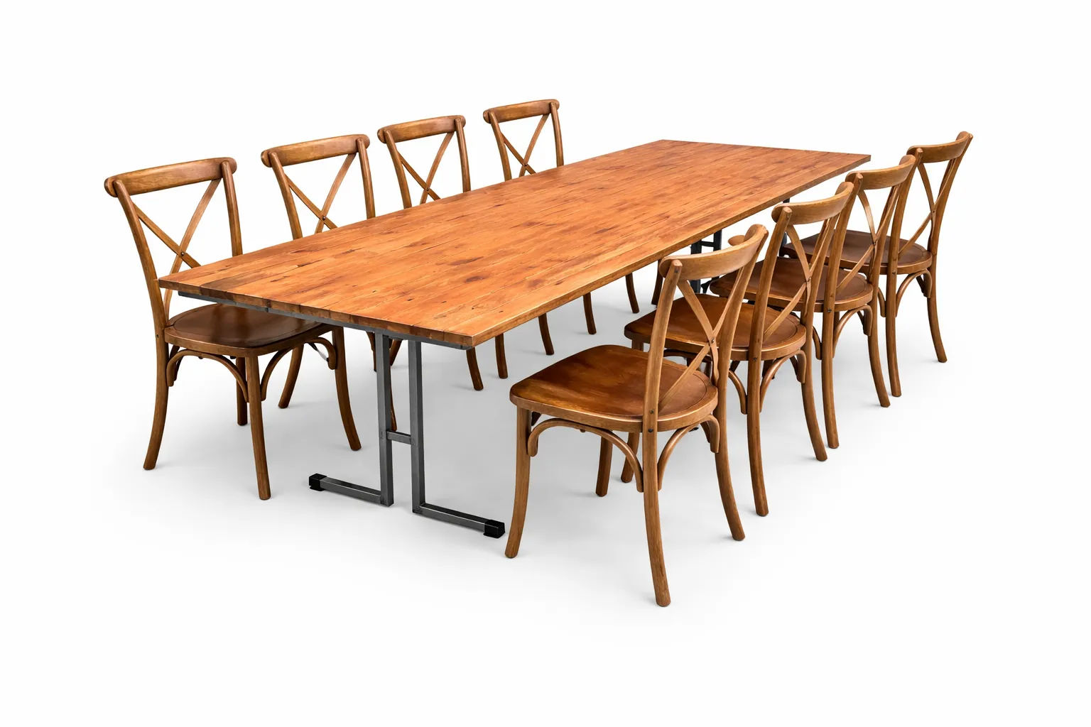 Table - Rustic Design Table 2.4 Long with Steel legs for additional support. These have been hand made and look great at the rustic style event. They are 2.4 and have steel longs for the additional support. The legs also do not get in the way of the seating and can seat 8 around the table with 4 at each side, if you need 10 that is no problem, just ass 2 more seats on each end.