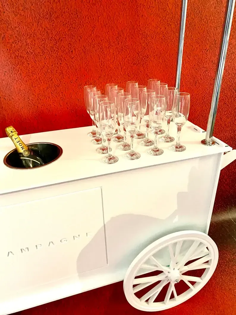 Our White Champagne Cart is one of Adept Hire’s most loved statement pieces, designed to elevate events and create a memorable guest experience. Elegant, well cared for and beautifully finished, this cart adds instant charm and sophistication to any celebration.